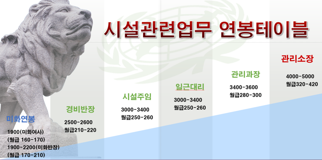 일반회사 행정, 관리업무에서 중년퇴직 후 노후까지 일할 수 있는 직업을 알아 보면서 시설관리 분야로 업종전환을 하였습니다. 시설기사로 여의도 ifc빌딩에 2017년 9월에 입사했으니 만으로 5년 절반이 조금 넘은 시점인 듯 합니다. 2017년 최초 연봉이 2300만원 정도로 기억하는데 세전 195만원 정도 였던것 같습니다. 세후로 따지면 180정도 였는데 4인 가족의 가장으로서 살아 가기에는 너무 부족했던 금액으로 기억합니다. 이제 시간이 지나서 현재는 관리소장을 하고 있고 지난 5년 동안의 시설분야의 직급별 연봉을 알려드리고 이글을 읽는 분들이 한 단계씩 나아가고 성장하는데 도움이 되면 좋겠습니다.