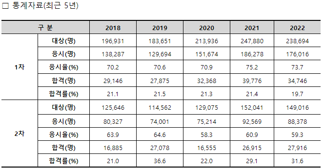 2차도 열심히 공부하여 합격이라는 후기를 남기도록 하겠습니다. 아래는 5년간 합격자 통계자료입니다.