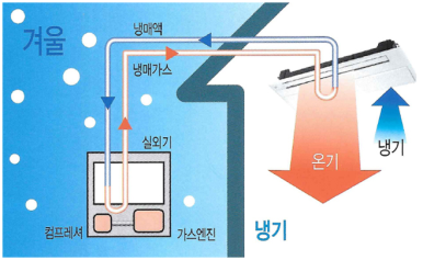 전기/가스로 엔진의 동력으로 구동되는 압축기에 의해 냉매를 실내기와 실외기 사이의 냉매배관으로 흐르게 하여 액화와 기화를 반복시켜 여름에는 냉방장치로, 겨울에는 난방장치로 이용하는 가스 냉난방 멀티공조 시스템입니다.