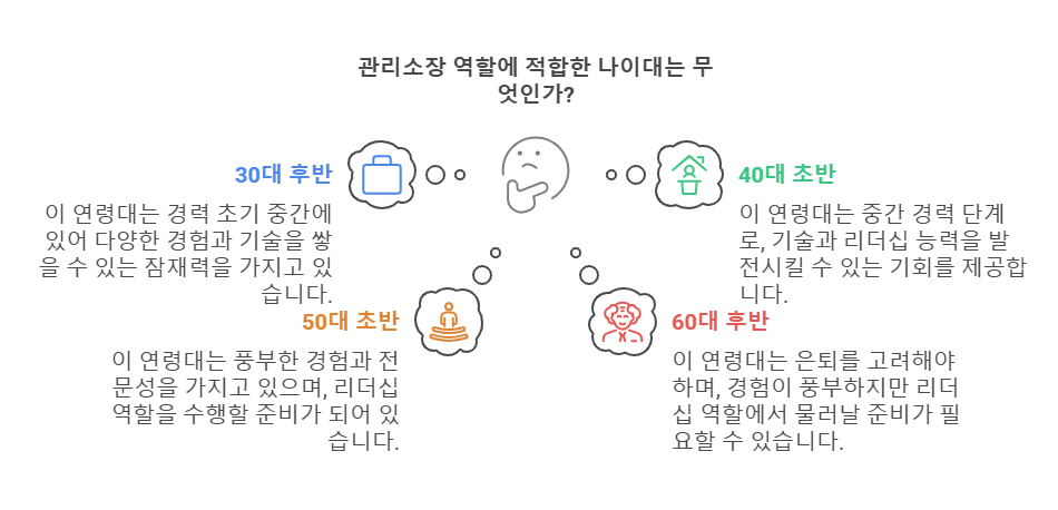 대체로 지식산업센터 관리소장은 30대 후반에서 60대 후반의 나이대에 위치하는 경우가 많습니다. 이 나이대는 다음과 같은 이유로 선호됩니다: