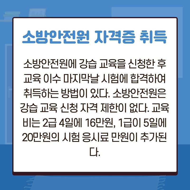 - 소방안전 관련 교육 이수 : 소방안전 관련 과목을 이수한 경력이 필요합니다.
