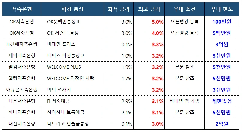 위의 표를 통해 각 저축은행의 파킹통장 상품을 비교해보시기 바랍니다.