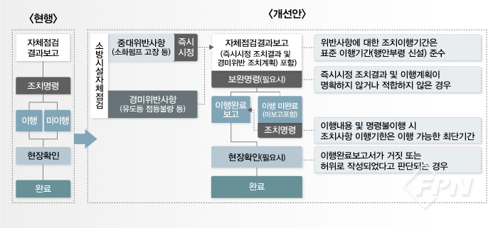 소방청은 불량 소방시설을 조기 개선하기 위한 방안도 구상했다. 점검 시 관리업자에 시정조치 요구권을 부여하고 관계인이 소방시설 수리ㆍ보수에 필요한 사항에 대해 이행계획서를 작성하는 한편 조치가 완료될 때 증빙자료를 관할 소방서에 제출하도록 의무화할 방침이다.
