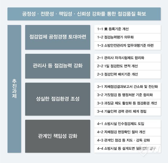 이번 종합대책에는 ▲점검업체 공정경쟁 토대 마련 ▲관리사 등 점검능력 강화 ▲성실한 점검환경 조성 ▲관계인 책임성 강화 등 단ㆍ중ㆍ장기 4개 전략 내 14개 세부과제가 담겼다.