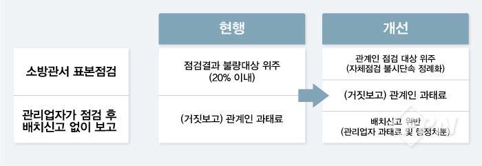 불명확한 거짓보고 개념도 바로잡는다. 점검결과를 사실과 다르게 보고한 사항은 관계인 벌금으로, 점검인력ㆍ일자를 허위로 적을 경우 관리업자에게 행정처분과 과태료를 부과할 계획이다.