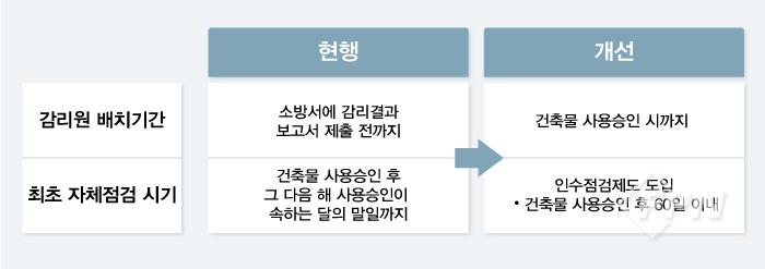 이에 소방청은 신축 건축물의 감리자 배치 기간을 현행 ‘소방서 감리결과 보고서 제출 전까지’에서 ‘건축물 사용승인 시까지’로 개선하고 최초 자체점검은 사용승인 후 60일 이내 받도록 하는 ‘인수점검 제도’를 도입할 방침이다.