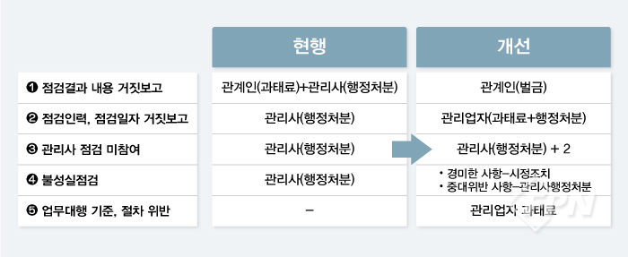 또 관리사가 점검에 참여하지 않으면 관리사에 대한 행정처분과 함께 관리업자에도 과태료와 행정처분을 내린다. 불성실한 점검의 경우 경미한 사항은 시정조치를, 중대 위반사항은 관리사에게 행정처분을 내린다는 구상이다.