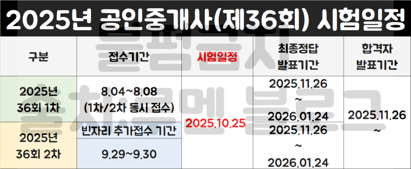공인중개사 시험은 부동산 중개와 관련된 법률 및 실무를 배우고 자격증을 취득하기 위한 시험입니다. 매년 많은 수험생들이 이 시험에 응시하여 부동산 업계에서의 경력을 쌓고 있습니다. 2025년 제36회 공인중개사 시험은 10월 25일에 실시될 예정입니다.