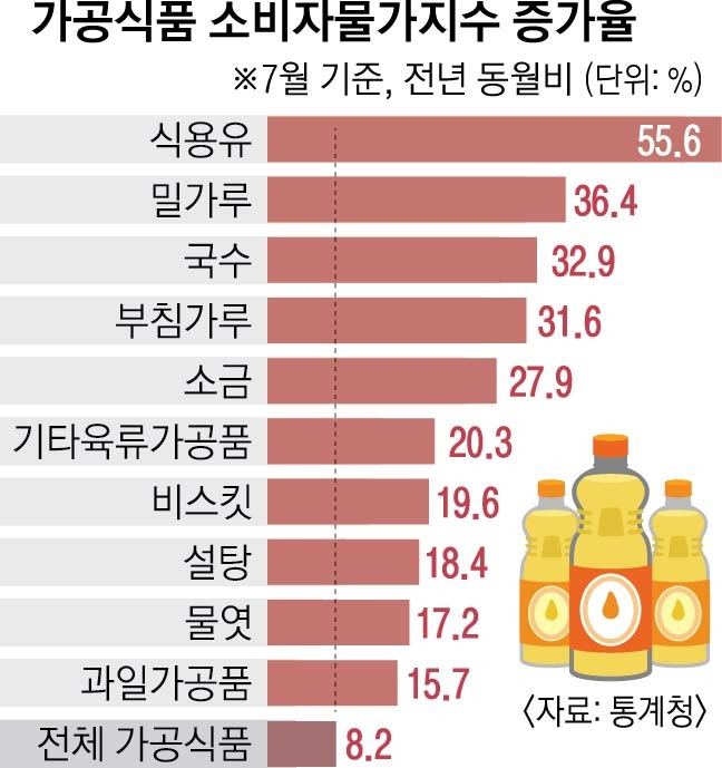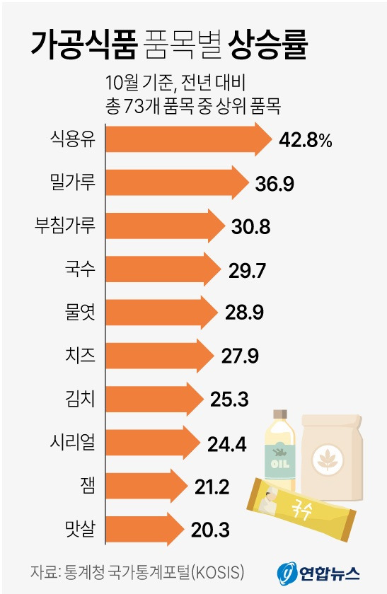 최근 가공식품의 물가 상승률은 매우 우려스러운 수치를 보이고 있습니다. 통계청에 따르면, 10월 기준으로 가공식품의 물가는 전년 대비 3.6% 상승한 것으로 나타났습니다. 이 중에서도 특히 요리유는 55.6%, 밀가루는 36.4%, 그리고 국물류는 32.9%의 상승폭을 기록했습니다.