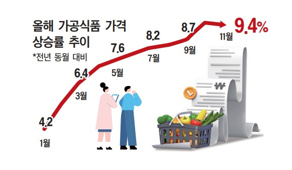 또한, 11월에는 물가 상승률이 9.4%에 달하는 등, 연말로 갈수록 그 상승폭이 커지고 있는 추세입니다. 가공식품의 가격이 이렇게 상승하는 이유에 대해 알아보겠습니다.