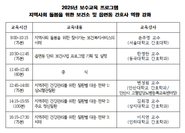 2025년에는 간호조무사의 역할을 강화하기 위한 교육 프로그램이 마련되어 있습니다. 이 교육은 지역 사회 건강 증진을 목표로 하며, 다양한 주제를 다룹니다.