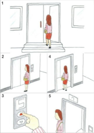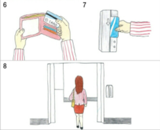 enter, stop, push, get, take, run, walk, office, elevator, building, button, floor, card, scanner, front, through