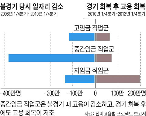 고용 시장은 경제의 변화에 따라 끊임없이 진화하고 있습니다. 2008년부터 2010년까지의 경제 위기 동안, 고용은 크게 감소하였고, 특히 중간 소득층의 일자리가 가장 큰 타격을 받았습니다. 이후 2010년부터 2012년까지의 회복기에는 저소득층 일자리가 조금씩 증가하였지만, 중간 소득층의 일자리는 여전히 정체 상태에 있었습니다. 이러한 데이터는 경제의 변화가 고용에 미치는 영향을 잘 보여줍니다.