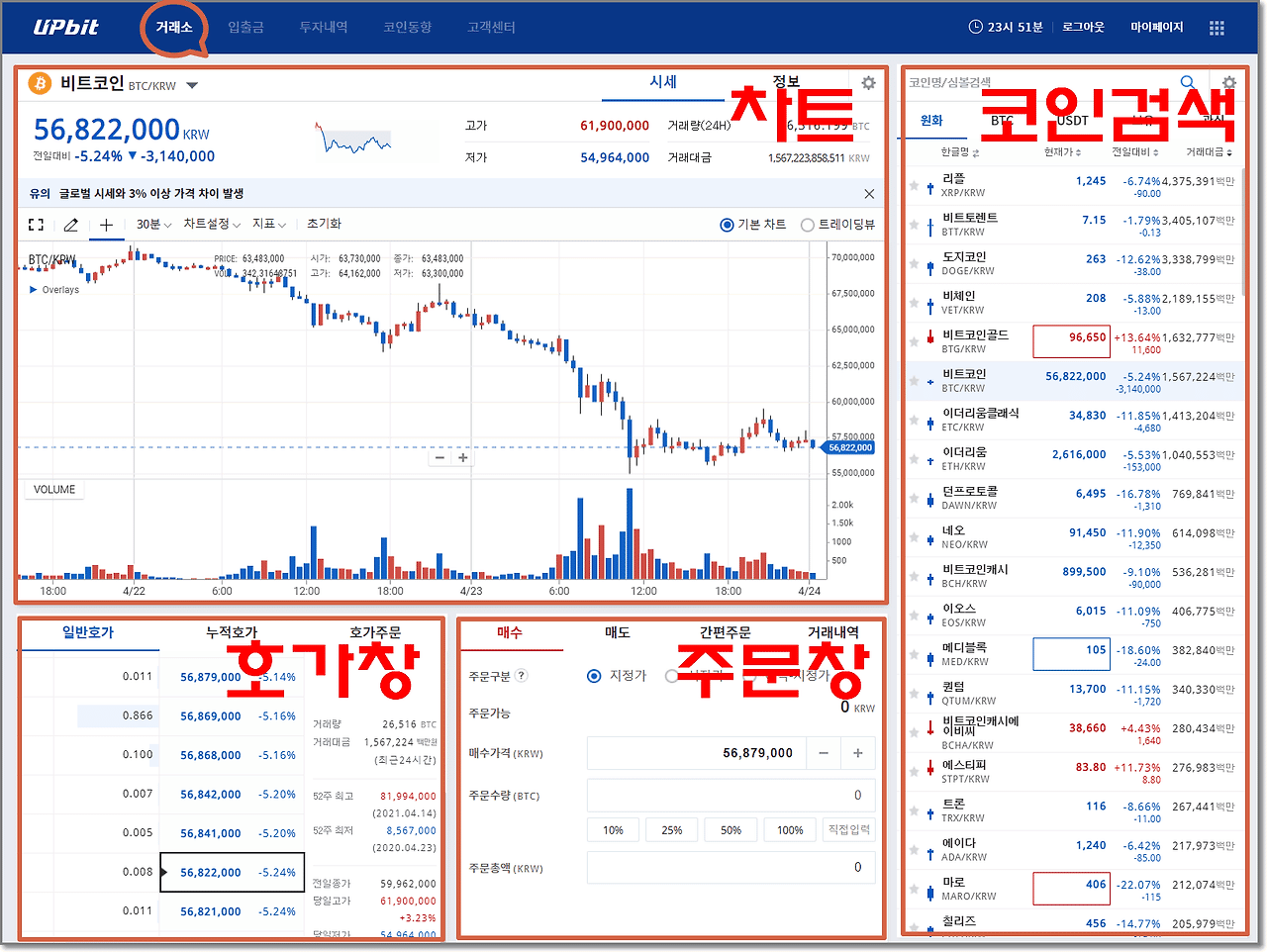 업비트의 기본 인터페이스는 사용자 친화적으로 설계되어 있습니다. 로그인 후 처음 보이는 화면은 현재 암호화폐의 가격과 거래 차트, 자산 현황 등을 한눈에 볼 수 있도록 구성되어 있습니다. 주로 사용되는 화면은 다음과 같습니다.