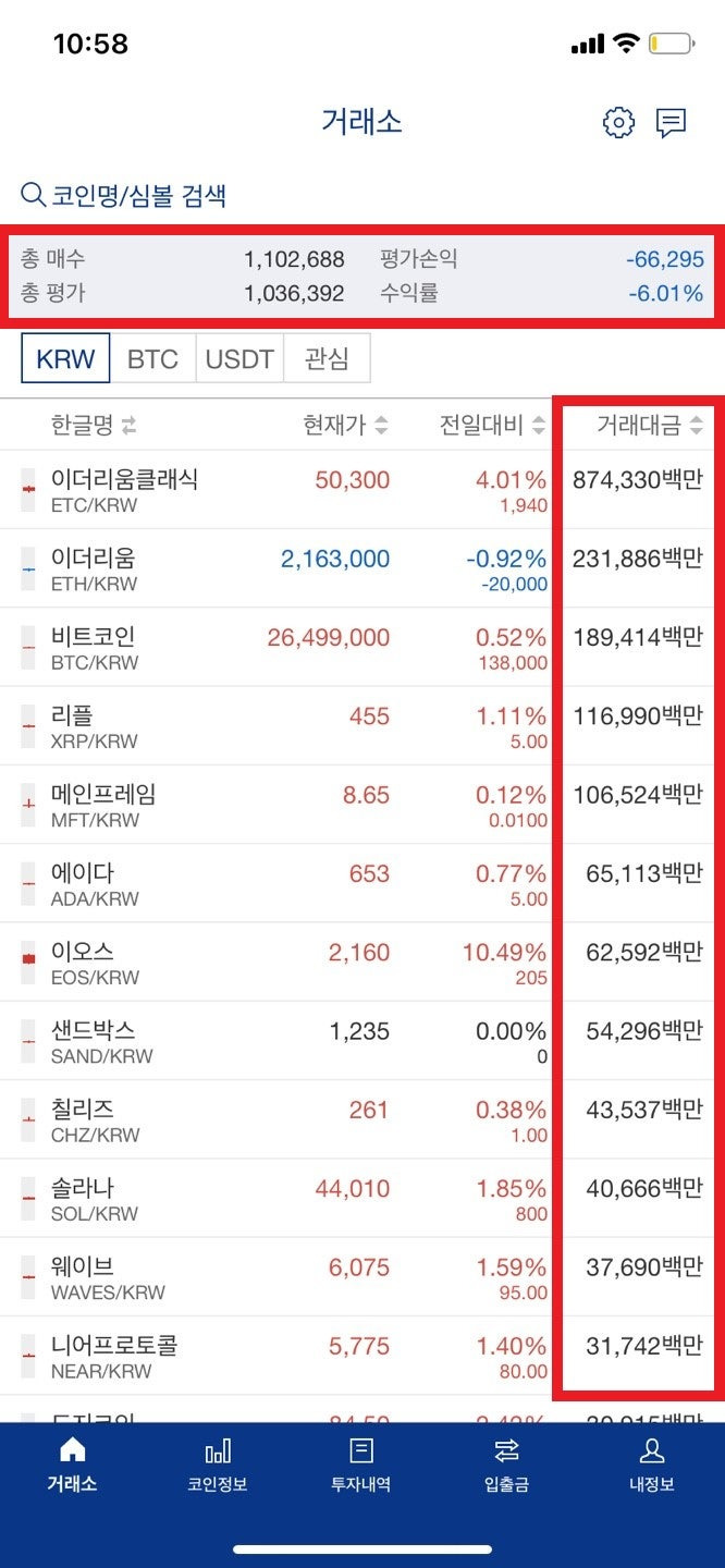 - 거래할 암호화폐 선택 : 메인 화면에서 거래하고 싶은 암호화폐를 선택합니다.