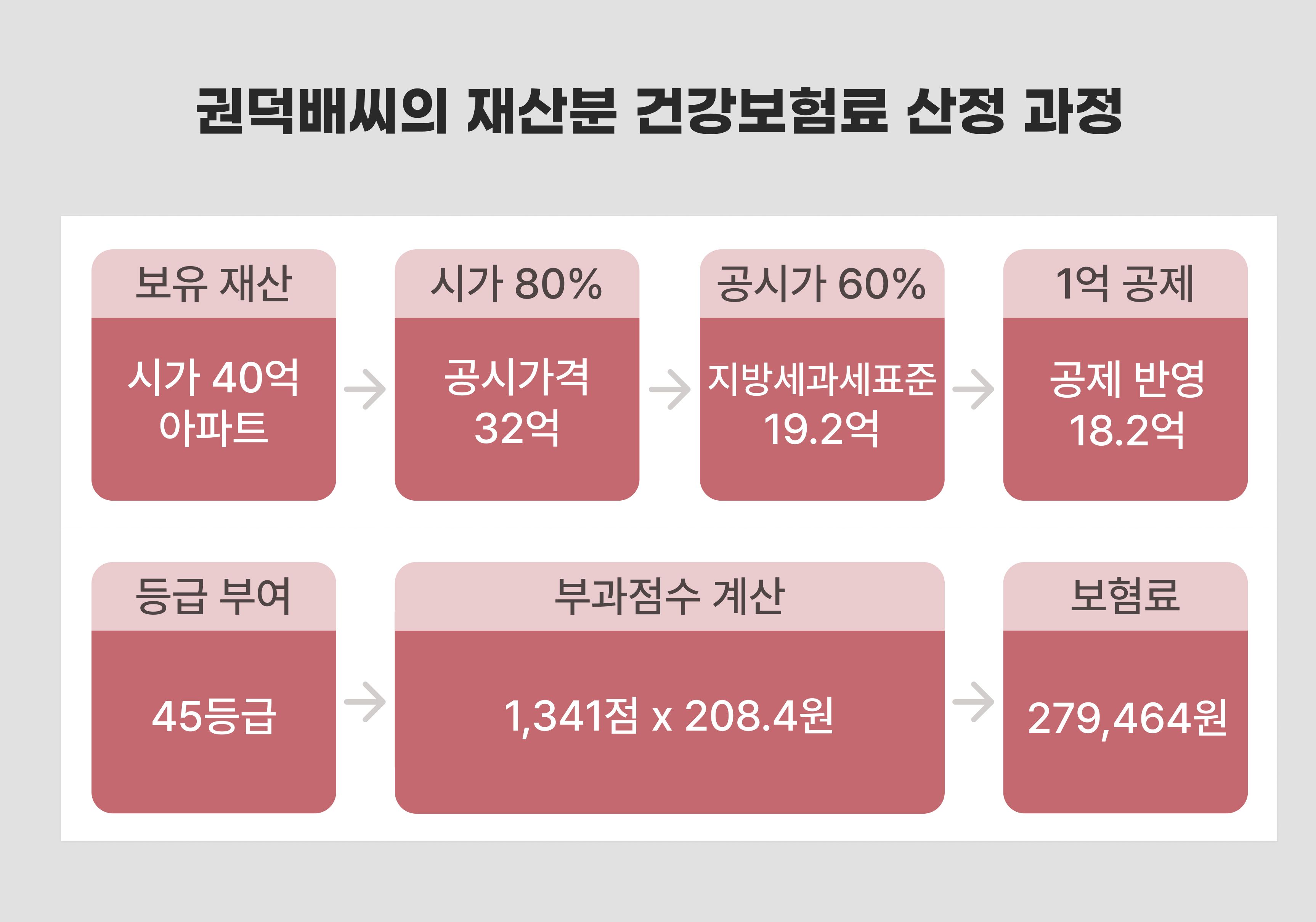 건강보험료는 소득과 재산을 기준으로 계산됩니다. 예를 들어, 소득이 1,000,000원일 경우, 건강보험료는 다음과 같이 계산됩니다.