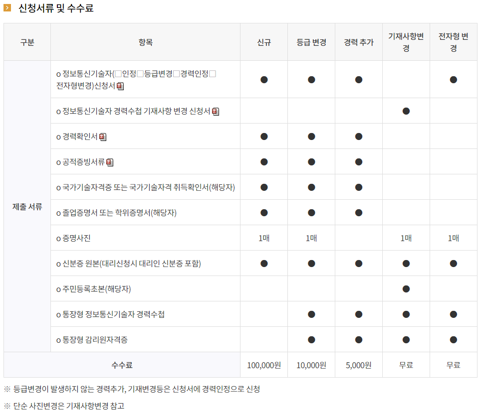 - 2. 경력관리 수수료 : 20,000원/년경력관리 수수료는 정보통신기술자의 경력을 항상 현행으로 유지관리하는데 필요한 인력과 전산시스템 운영 및 정보통신기술자에게 신기술공법과 기술관련 정보의 제공 등을 위한 기술정보지 발간 등에 필요한 소요재원으로 쓰여집니다.