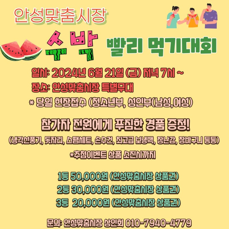 안성맞춤시장에서는 다양한 이벤트가 열립니다. 예를 들어, 오는 2024년 6월 21일에는 수박 먹기 대회가 개최될 예정입니다. 이 대회는 청소년과 성인 모두 참여할 수 있으며, 상위 3명에게는 현금 상품이 주어집니다. 이러한 이벤트는 시장을 더욱 활기차고 즐거운 장소로 만들어 줍니다.