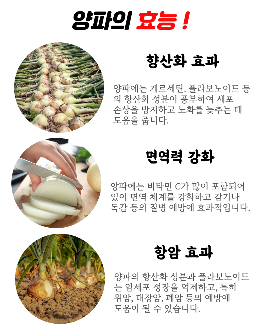 제주 햇양파는 여러 가지 건강 효능으로 유명합니다. 양파의 주요 성분인 퀘르세틴은 항산화 작용을 통해 노화를 예방하고, 혈액을 맑게 해주는 효과가 있습니다. 또한, 혈관 건강을 지키는 데 도움을 주며, 심장병과 같은 심혈관 질환 예방에도 효과적입니다.
