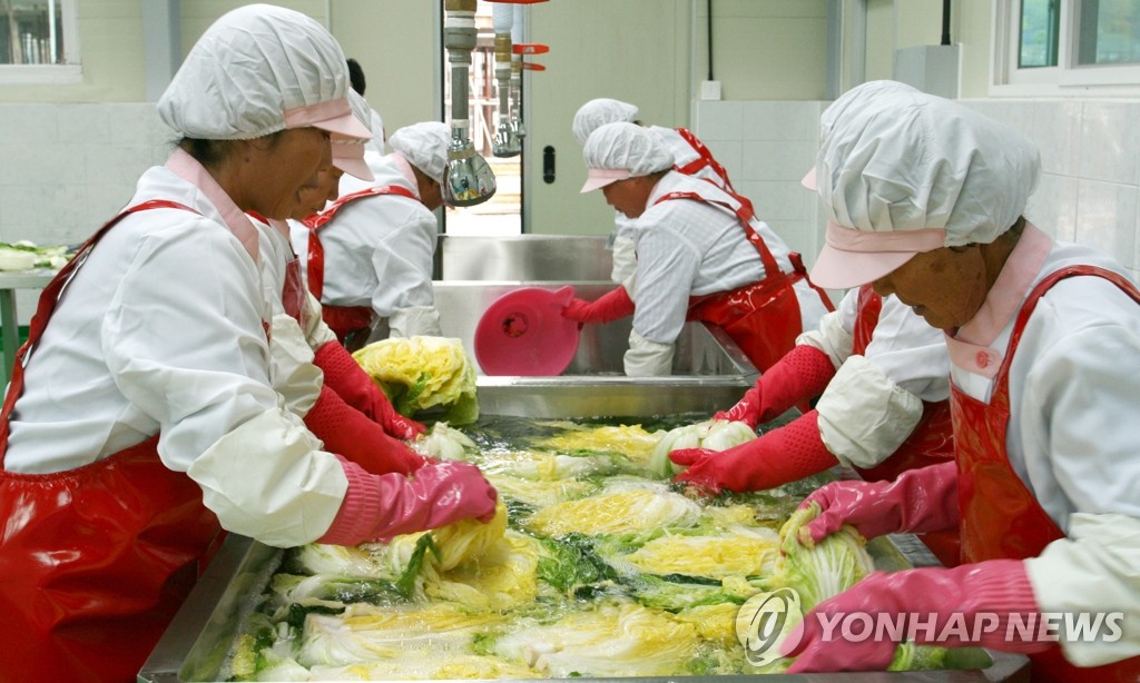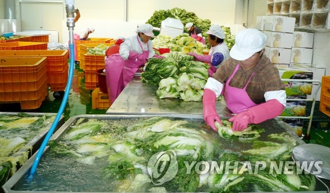 에서는 작업자들이 절인 배추를 손질하고 있는 모습을 볼 수 있습니다.