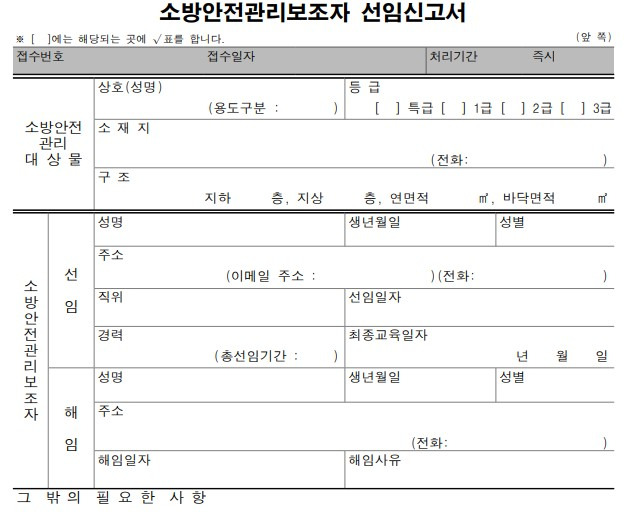 소방보조자를 선임하기 위해서는 '소방안전관리보조자 선임신고서'를 작성해야 합니다. 이 신고서에는 선임자의 이름, 연락처, 자격증 정보, 선임 기간 등을 기입해야 하며, 서명란도 포함되어 있습니다. 신고서 양식은