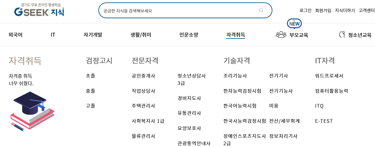 제가 경기도 사는 관계로 경기도 기준으로 먼저 설명을 드리도록 하겠습니다. 일단 다음이나 네이버에서 "경기도 지식"이라고 검색창에 입력하시고 엔터를 치시면 아래그림처럼 최상단에 GSEEK사이트로 접속하실수가 있습니다.
