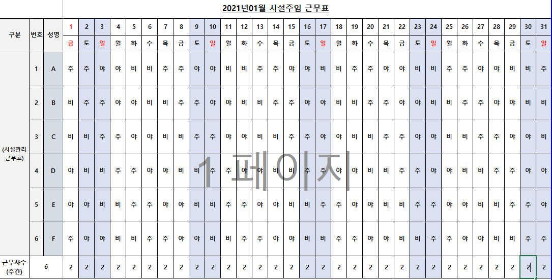 예를 들어 아래 근무표를 보시면 쉽게 이해하실 수 있습니다. [아래표는 주주야야비비 근무표임]