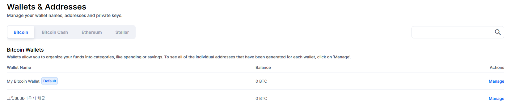 만들어진 지갑 우측에 MANAGER버튼을 클릭한후