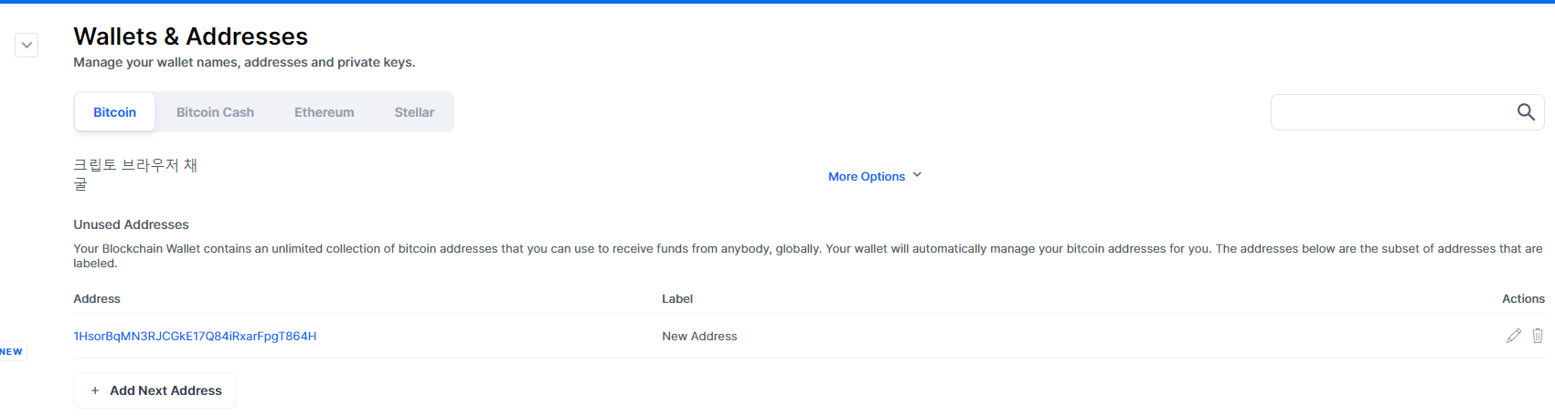 다음에 'NEW WALLET(새지갑)' 버튼을 클릭하면 지갑병이 생성되고 저는 크립토 브라우저에 있는 채굴한 비트코인을 출금하기 위해 "크립토 브라우저 채굴" 지갑을 만들었습니다'다.