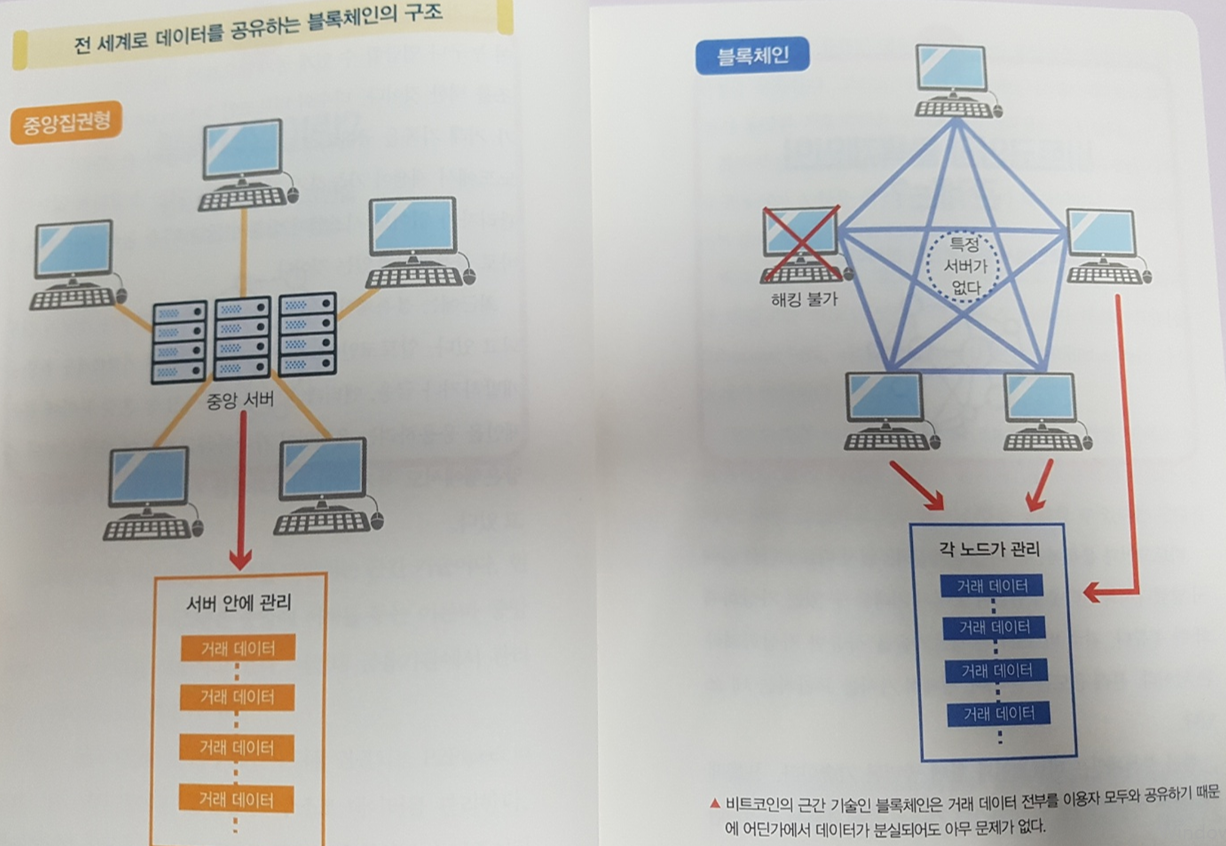 하지만 블록체인은 개인과 개인이 직접 연결되는 P2P(PEER TO PEER)네트워크 형식의 "분산장부"구조로 데이터를 관리한다. 블록체인에 기반을 둔 비트코인은 과거부터 현재까지 이루어진 모든 거래를 쭉 기록하고 공개한다. 데이터를 체인처럼 연결하여 누구나 열람할 수 있게 공개함으로써 서로서로 감시하는 구조를 택한 것이다. 다수의 비트코인 노드(node : 네트워크 참가자)가 거래 기록을 공유하므로 데이타 일부분이 손상되어도 다른 노드에서 재생이 가능하기 때문에 데이터는 소실되지 않는다. 관리자가 없어도 시스템이 멈추지 않고 계속 돌아가는 이유가 바로 블록체인에 있는 것이다.