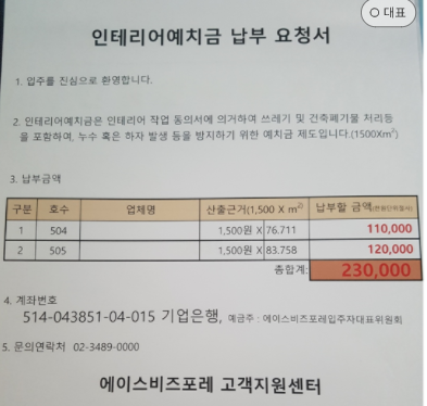 인테리어 공사 관련 에피소드로 관리사무소에 자주 방문하여 인테리어 예치금을 차일피일 미루면서 입금을 하지 않은 업체가 있었는데 차량통제를 하였더니 예치금을 납부하였다. 결국에는 폐기물도 치우지 않고 공사가 끝나서 알게 된 사항은 일당으로 일한 분들이 관리사무소로 와서 인건비도 받지 못했다는 이야기를 들었을 때 예치금을 받지 못했다면 관리사무소 비용으로 손실이 일어날 뻔했던 기억이 난다. 그 업체가 남기고 간 폐기물 처리비용이 20만 원 정도 추가비용이 들어갔으나 인테리어 예치금으로 처리하였다. 초보 소장이나 관리과장은 이런 점을 필히 알고 있어야 할 것 같다.
