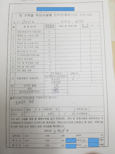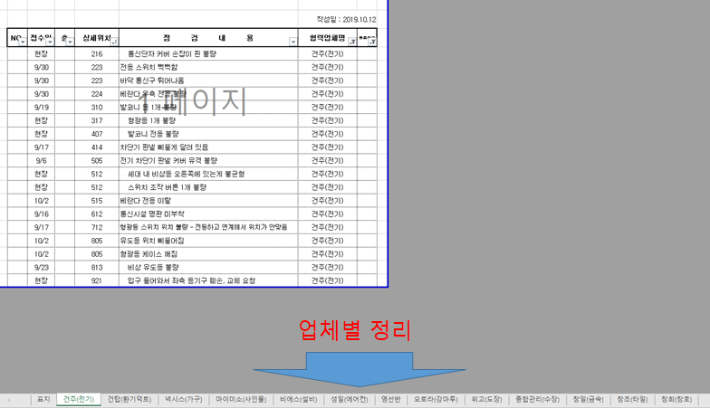개별세대 하자는 입주시 입주세대점검 시 작성하는 주요 시설물 인수인계서를 통해 하자사항을 체크하고 이렇게 세대별로 한 장 한 장 접수한 내용을 기간별(주간별, 월별)로 묶어서 시공사로 전송하면 시공사에서 엑셀로 하자보수 항목에 대한 보수업체별로 정리하여 보내 주었다.