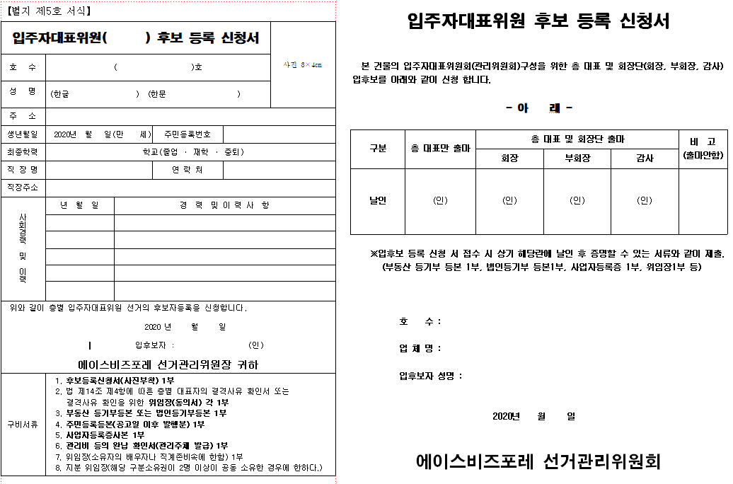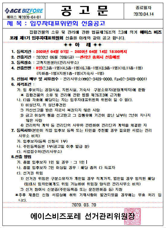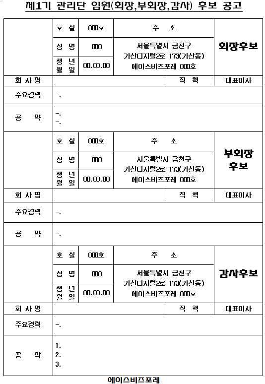 건물마다 입대표 지원자가 많은 경우도 있지만 우리건물의 경우에는 입대표 후보자가 2명만 지원하여 관리사무소에서 추천을 드려 입대표를 최소임원 4명(회장, 부회장, 감사, 총무)으로 구성을 하였다. 입대표 후보등록을 마치면 입주민들에게 후보자 등록이 되었음을 알려야 하기에 임원 후보공고를 하게 된다. 후보공고 양식에는 국회의원이나 대통령 선거 때처럼 나름 공약을 넣어 입주민들이 어떤 사람을 뽑아야 건물관리가 잘 될지를 판단할 수 있게 안내한다.