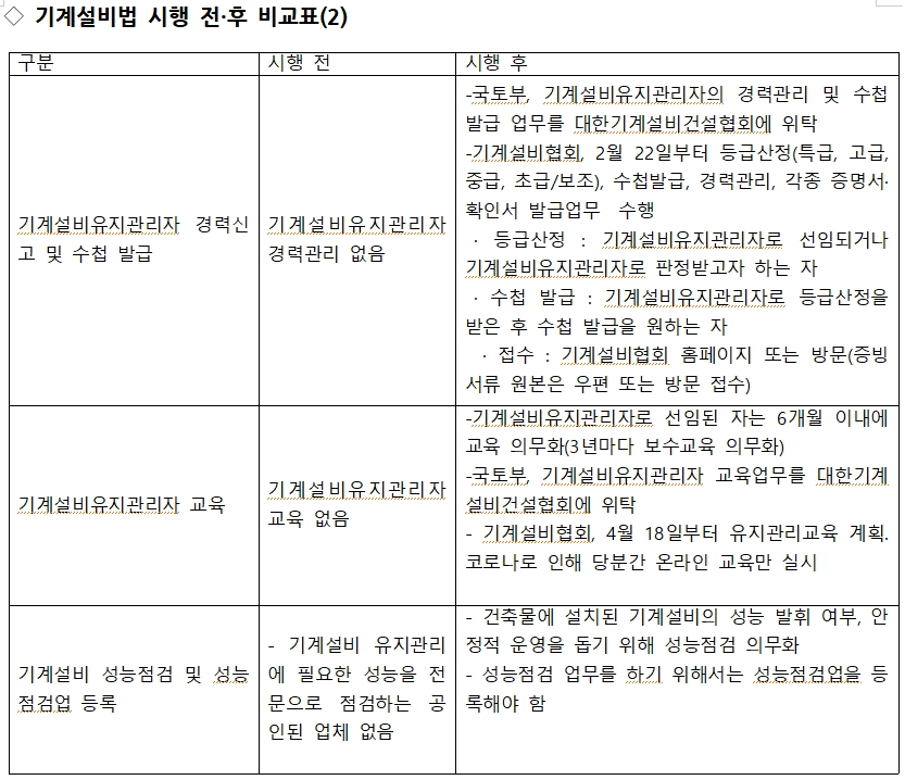 ▶기계설비유지관리자 경력신고 및 수첩 발급=국토교통부는 기계설비유지관리자의 경력관리 및 수첩 발급 등 관련 업무를 대한기계설비건설협회에 위탁했다. 기계설비유지관리자는 경력신고 시 국가기술자격증, 건설기술자수첩 등 자격 증명서류와 유지관리 업무 경력 증명서류를 첨부해야 한다. 자세한 사항은 협회 콜센터(1661-3344)로 문의하면 된다.