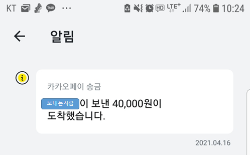 위에서 받기를 했을 때 본인의 카카오페이에서는 알림에 보낸 사람과 입금액이 도착했다는 알림을 보내줍니다.