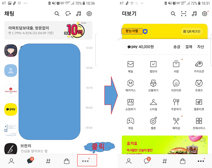 돈 받기는 너무 간단한데 그럼 돈을 송금하는 방법도 알고 계시면 더욱 편리한 카카오페이 서비스를 이용하실 수 있겠죠? 카톡을 열면 가장 먼저 보이는 친구리스트 오른쪽 하단에 점 3개 아이콘 보이시죠? 점 3개 아이콘을 클릭하면 자신의 프로필 밑에 타인으로부터 받은 카카오페이 또는 충전하신 금액이 보이고 오른쪽으로 '송금, ' '결제, ' '자산, '이라는 링크가 보입니다.